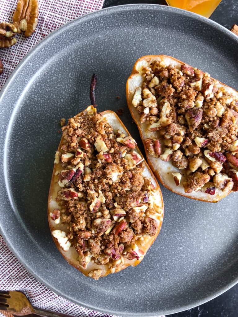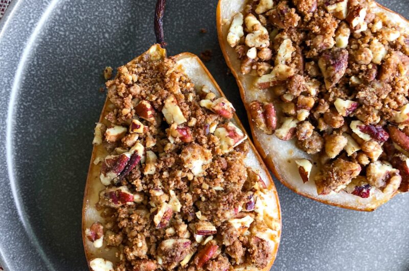 - Layer the pecan streusel on top of the pear. Bake for 20-24 minutes.