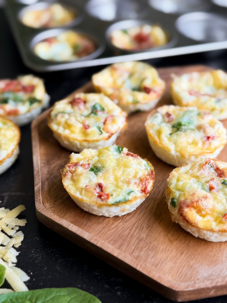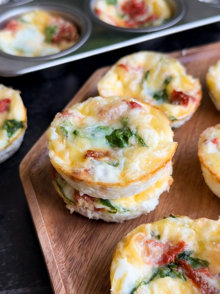 - Disperse the shredded cheese between the muffin slots along with the salt, granulated garlic, chopped spinach, and sun-dried tomatoes.