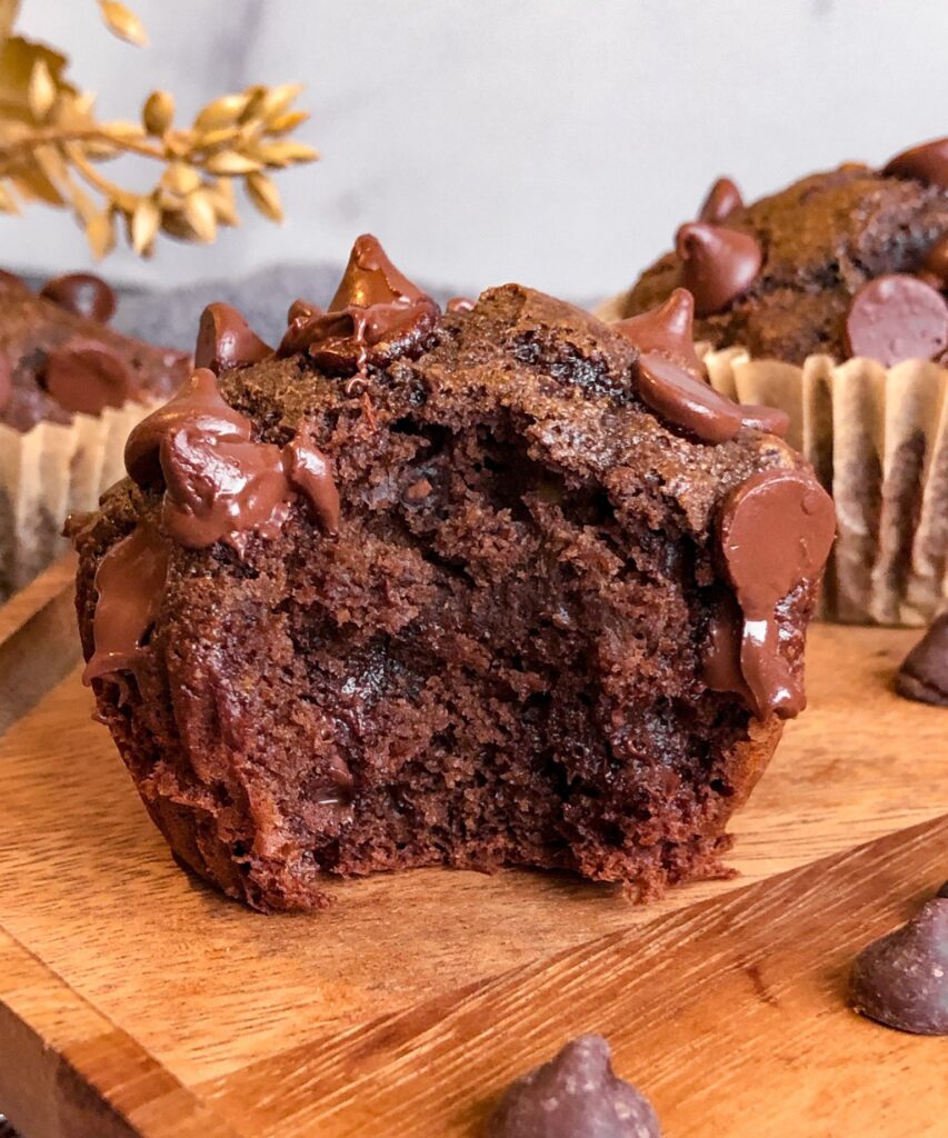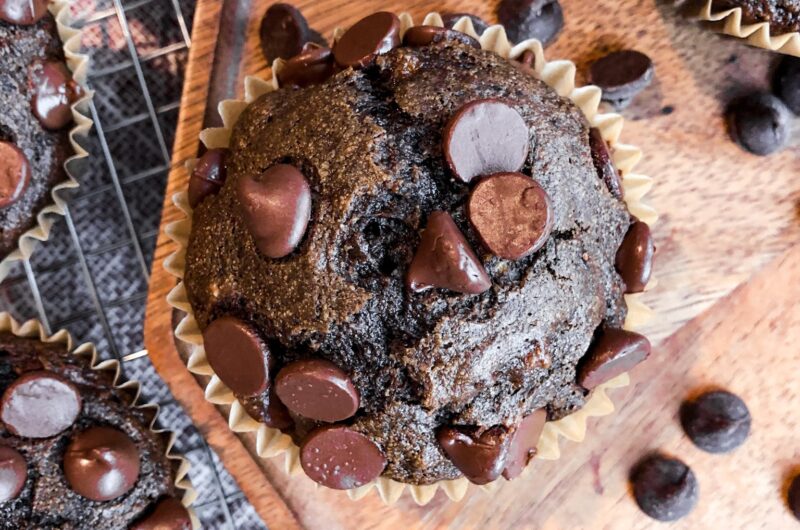 If you want to make a loaf instead of muffins, simply put the batter into a greased 8×4 bread pan and bake for 45-55 minutes until a toothpick comes out with a few moist crumbs, but not raw batter. Remember to test another spot if you accidentally poked melted chocolate.