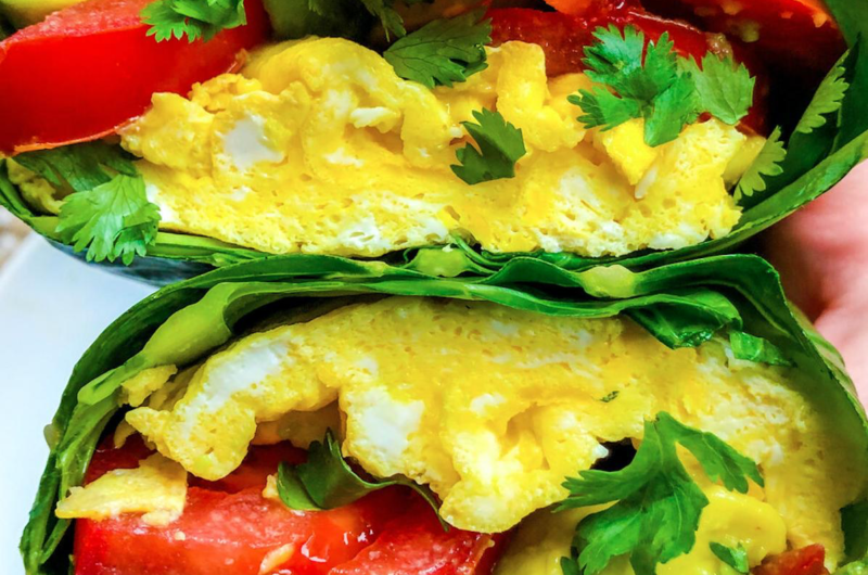 Scramble eggs on low heat with salt and pepper. Wrap in collard green leaves with avocado, tomato, and cilantro.