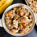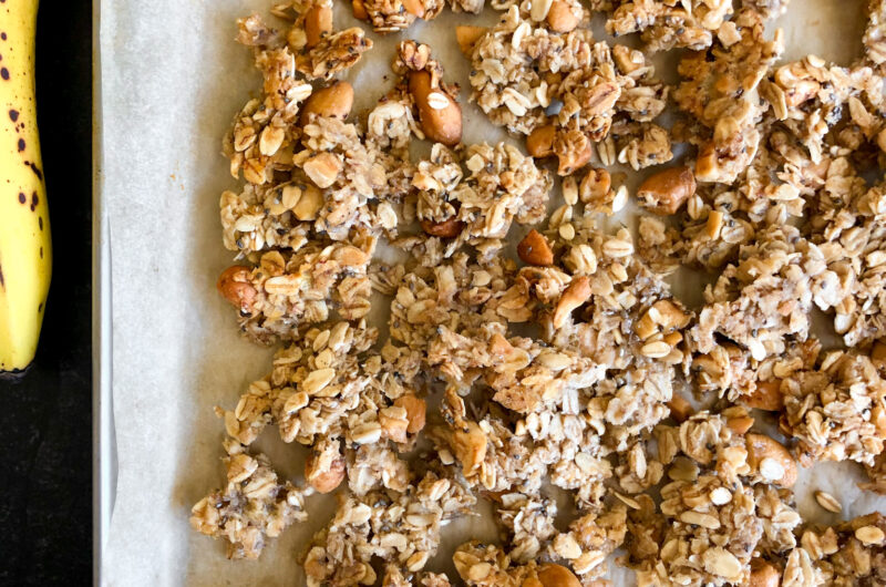 I typically use spotty bananas for making banana bread or muffins, but today I decided to try something new! This Delicious Banana Granola is a new staple in my household. I love keeping granola on hand for snacks, as cereal, as a topping for yogurt bowls, smoothie bowls, etc. It’s so versatile and scrumptious. I obviously love making granola because I’ve post many other flavors! It’s definitely fun to come up with new combinations.