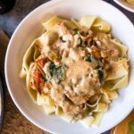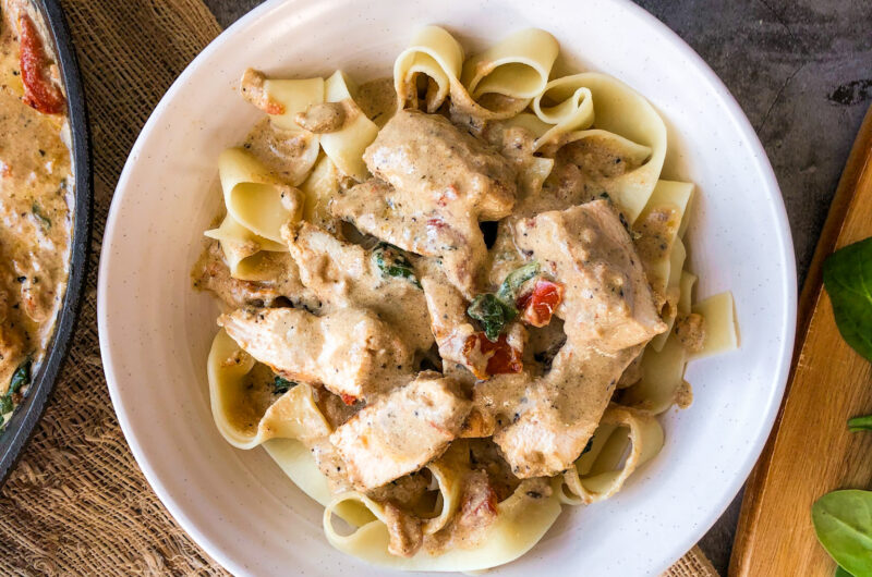 Yum, yum, yum. I just can’t get enough of this Tuscan Chicken Pasta Bowls recipe! I’ve made it several times, altering it each time, and this is definitely my favorite version that I made. I also tested it out in a crockpot and loved that as well. However, I will admit that it turns out much yummier cooked in a skillet! But if you are interested in the crockpot version, then be sure to read the post to see instructions for how to do that. No matter which way it’s made, the flavors in Tuscan food are incredible. Check out my homemade sun-dried tomato recipe that I posted a couple months ago, because they’ll come in handy for this recipe. Homemade sun-dried tomatoes are much tastier than store-bought in my opinion, but if you have a store-bought brand that you love, then you can of course use that if you want!