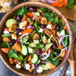 I hope you love this Greek Salad with Croutons & Toasted Pecans! Please leave a comment and rating if you try it out, I would love to know what you thinkv
