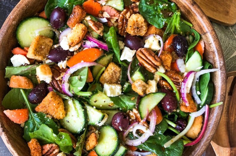 This Greek Salad is absolutely LOADED with flavor! I love Greek-inspired salads combined with other popular flavors, such as the croutons, toasted pecans, and balsamic vinaigrette. Although it may be incorporating multiple cuisines, the flavors come together perfectly. Salads are also great because they are easy to customize to your preference. Add or omit any toppings to suit your own taste preferences and you’re all set!