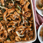 • Prep entire casserole ahead of time: If you want to save yourself the time needed to make this on Thanksgiving, you can prep it up to a couple days before! Keep it tightly covered in the fridge then bake for 20-25 minutes when ready. You can put broil on for just a minute or two to crisp up the onion even more if desired – Just watch it the whole time because it happens fast and you don’t want it to burn. You can also just prep the casserole ingredients but wait until thanksgiving day to put the crispy onions on top of the casserole if you’re wanting the onions to be fully crispy.