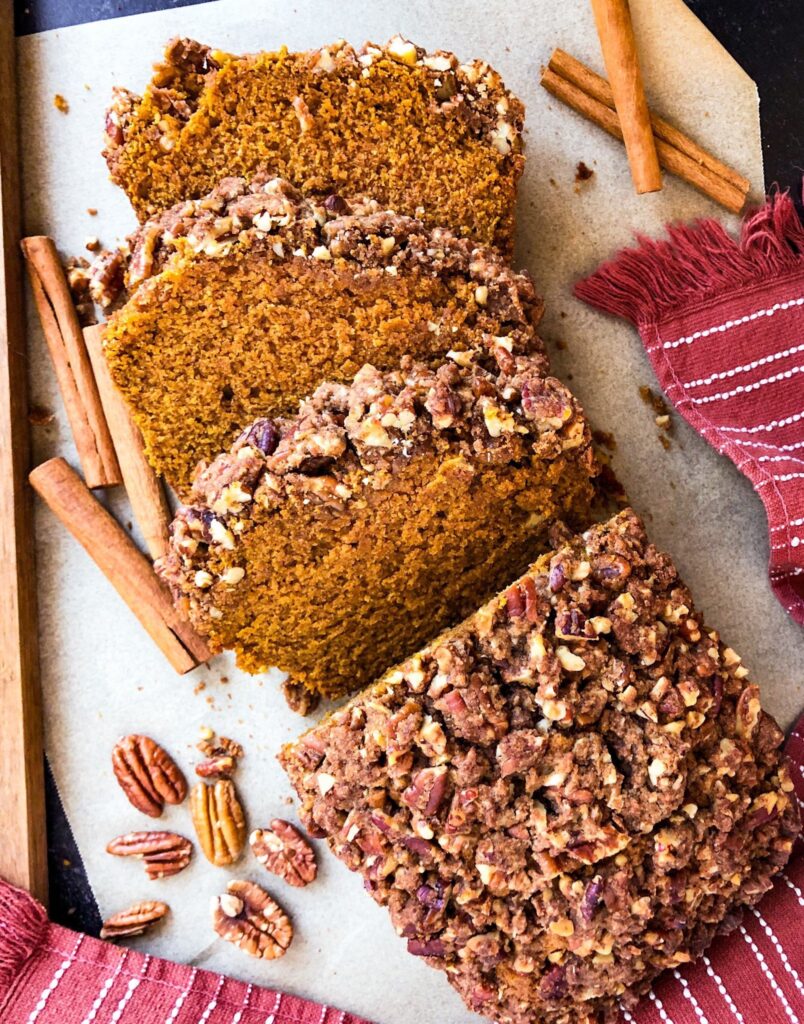 If you would rather make pumpkin muffins instead of pumpkin bread, then be sure to check out this Pumpkin Muffin recipe that I posted a few weeks ago. It’s basically the same recipe but I dispersed the batter into muffin cups rather than a bread pan. You can still use the pecan streusel from this recipe and add it to the muffins – you’ll make the exact same amount for it.