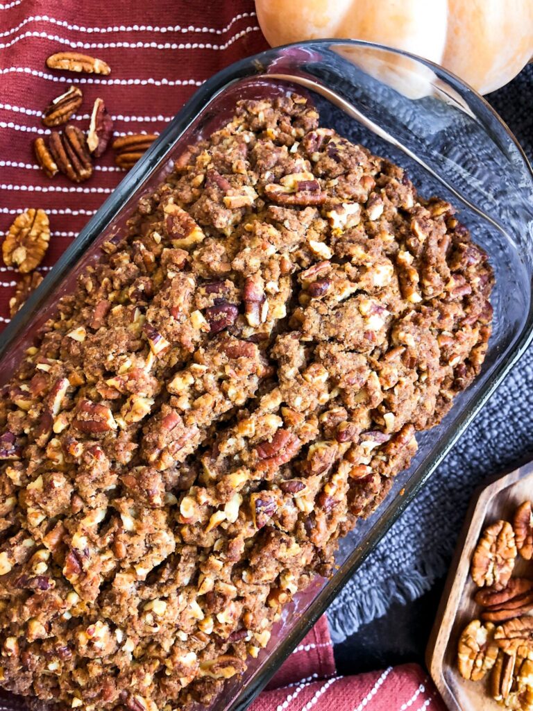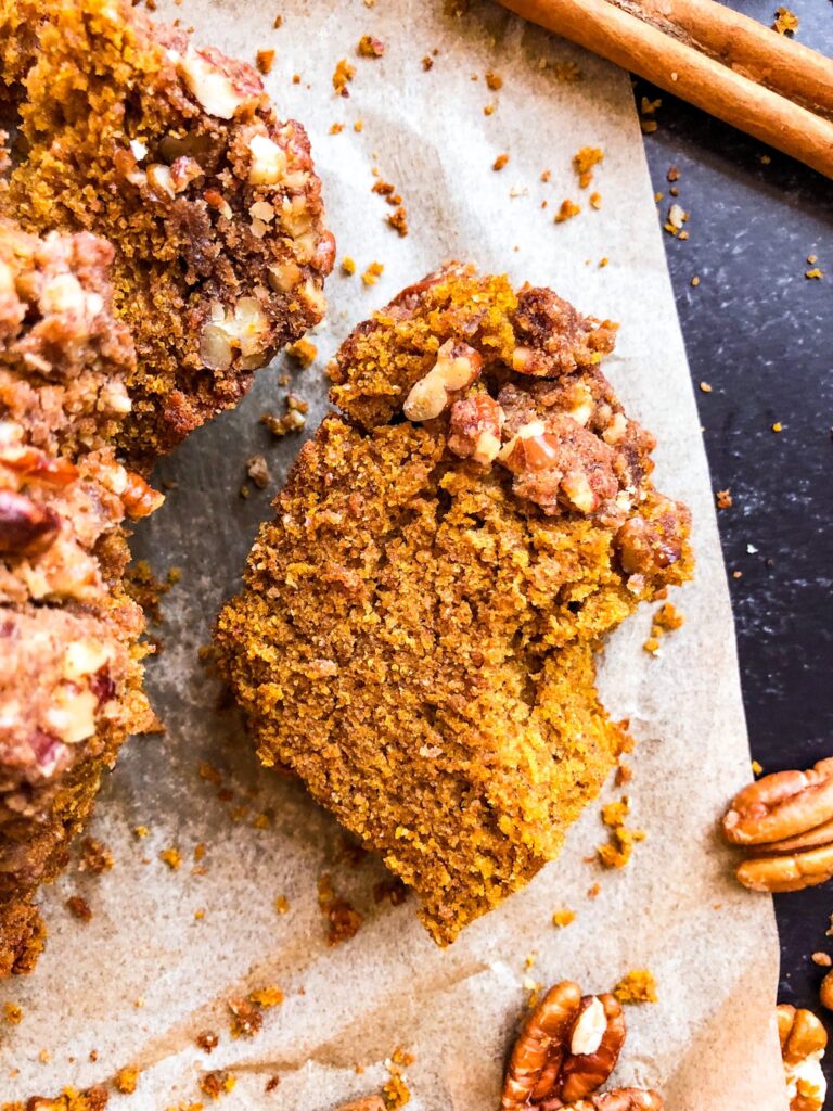This is hands down my favorite recipe right now. The pecan streusel is perfectly buttery, sweet, and crispy, and the pumpkin bread is thick and moist. I will definitely be using the pecan streusel recipe on many more breads/muffins/etc. It is so good! I plan to make a post for the streusel by itself so that it can easily be searched on my website and added to any recipe you want. Even if you don’t like pumpkin bread, it would go great on banana bread, banana muffins (gluten-free), blueberry muffins, apple crisp, and more. It’s a great staple recipe for taking your desserts to the next level! Another idea I have is to use it as a topping on baked pears – yum! I’ll be sure to post a recipe for it when I make it.