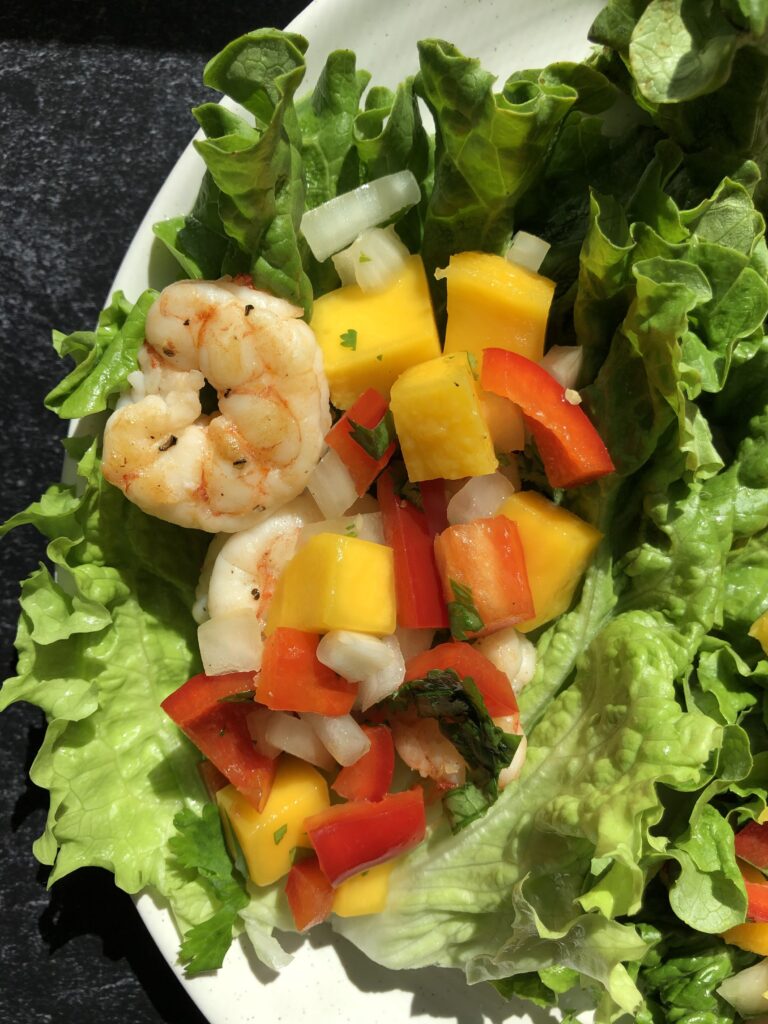 3. Place your lettuce on a plate, put the cooked shrimp on top, then put mango salsa on top.