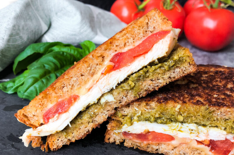- Spread the pesto sauce on the bread and layer with the cheese, tomato, chicken breast, and fresh basil leaves or greens if you have them/want them. Place the other slice of bread on top.