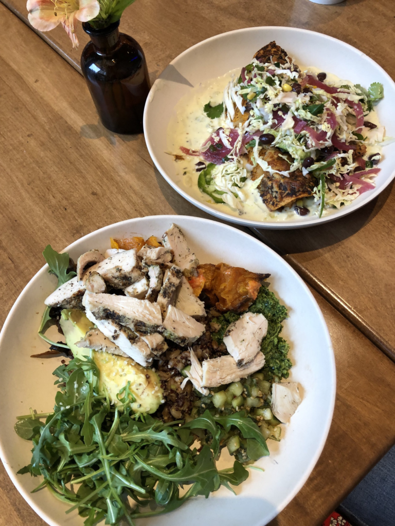 Our dinner from Flower Child: My husband ordered the Chicken Enchilada Bowl and I ordered the Mother Earth Bowl with chicken added on top.