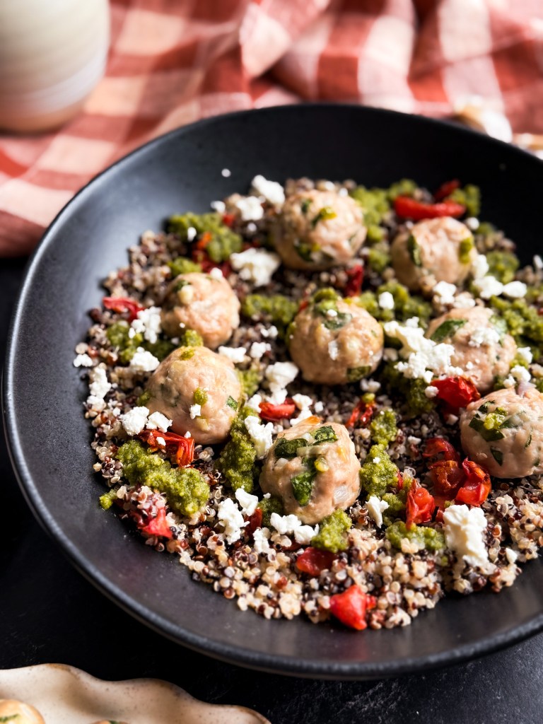 - To serve: Place the meatballs on a bed of quinoa with the sun-dried tomatoes, pesto sauce, and crumbled feta. Enjoy!